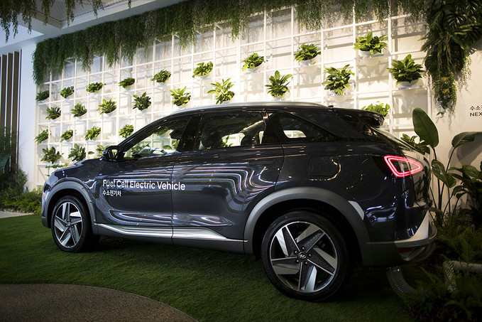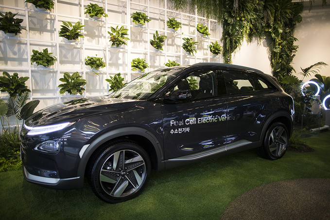 현대자동차가 28일 오전 경기도 고양시 킨텍스에서 열린 2019 서울모터쇼 프레스데이 행사에서 수소전기차 넥쏘를 선보이고 있다.