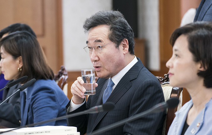 이낙연 국무총리가 23일 오후 서울 종로구 정부서울청사에서 열린 제2차 규제자유특구위원회에서 물을 마시고 있다.