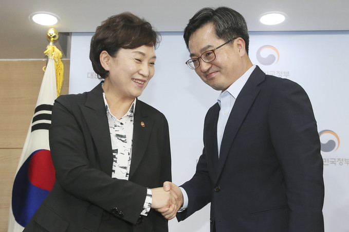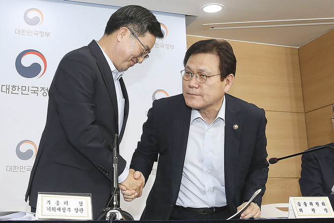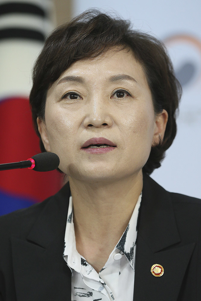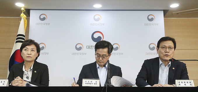 김동연 부총리 겸 기획재정부 장관과 김현미 국토교통부 장관, 최종구 금융위원장이 13일 오후 서울 종로구 정부서울청사에서 주택시장 안정방안 관련 관계부처 합동브리핑을 마친 뒤 취재진의 질문을 받고 있다.