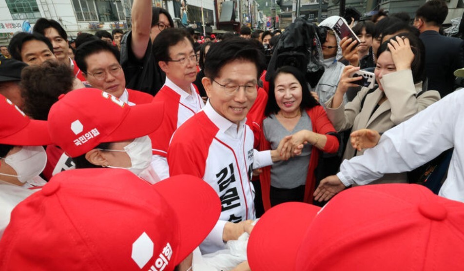 | ▲ 국민의힘 김문수 대선 후보가 16일 오전 경기도 수원시 팔달구 지동시장을 찾아 인사를 나누고 있다. [뉴시스] |