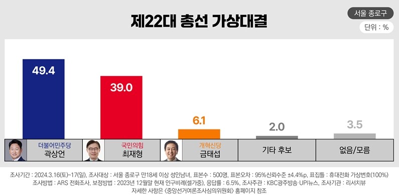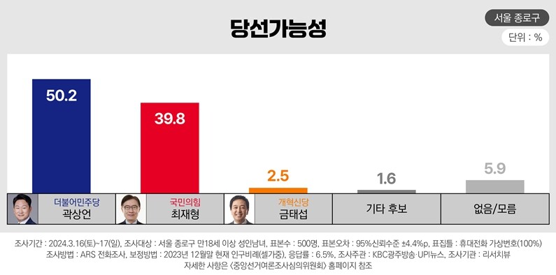 4·10 총선 서울 종로에 출마한 더불어민주당 곽상언 후보가 국민의힘 최재형 후보를 오차범위 밖에서 앞서는 것으로 19일 나타났다.