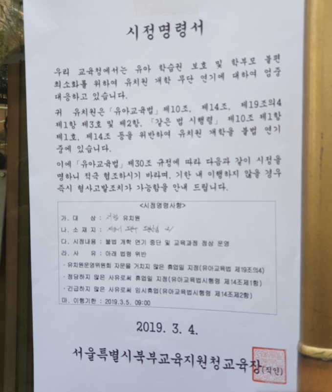 정부는 이날 개학을 연기한 유치원에 개학 명령서를 전달하거나 유치원에 붙이는 방식으로 시정 조치에 나선다. 5일에도 개학하지 않는 유치원은 즉시 형사고발할 예정이다.