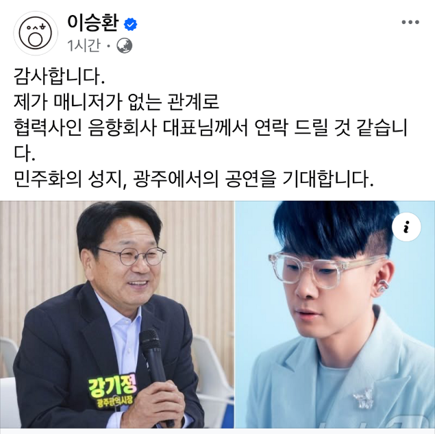 강 시장은 24일 자신의 페이스북에 "구미시가 이승환 가수의 콘서트 대관을 취소했다는 소식을 들었다. 그럼 광주에서 합시다"고 말했다.