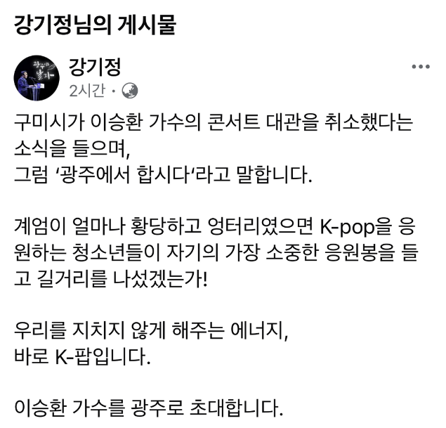 또 "계엄이 얼마나 황당하고 엉터리였으면 K-pop을 응원하는 청소년이 응원봉을 들고 거리에 나섰겠는가. 우리를 지치지 않게 해주는 에너지, 바로 K-pop이다"며 "가수 이승환을 광주로 초대한다"고 초청했다.