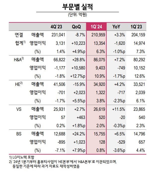 ▲ 2024년 1분기 부문별 실적 요약 [LG전자 IR자료 캡처]