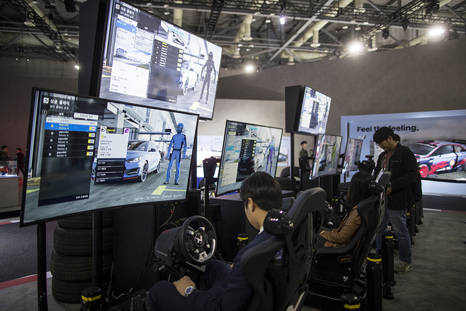 28일 오전 경기도 고양시 킨텍스에서 열린 2019 서울모터쇼 프레스데이 행사 현대자동차 체험부스에서 취재진들이 레이싱 게임을 체험해보고 있다.