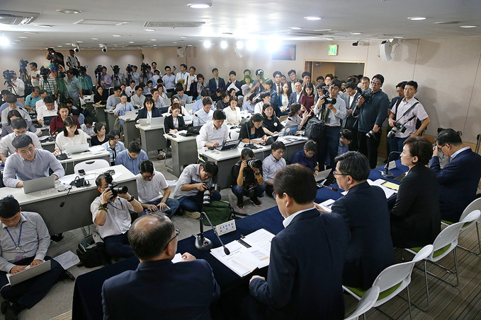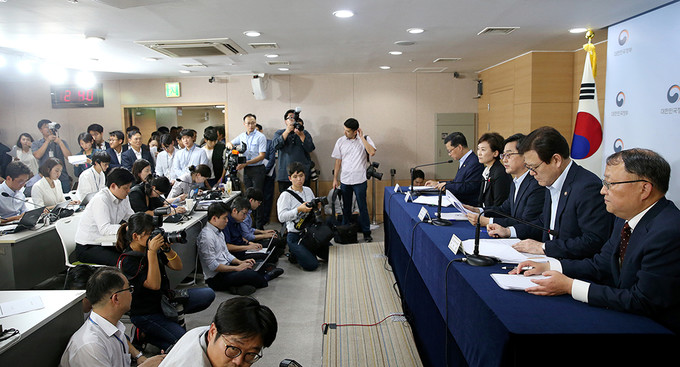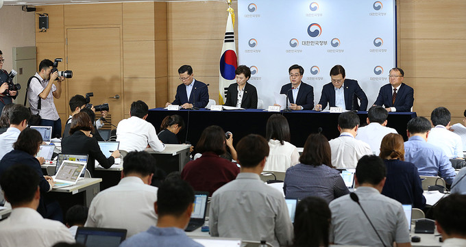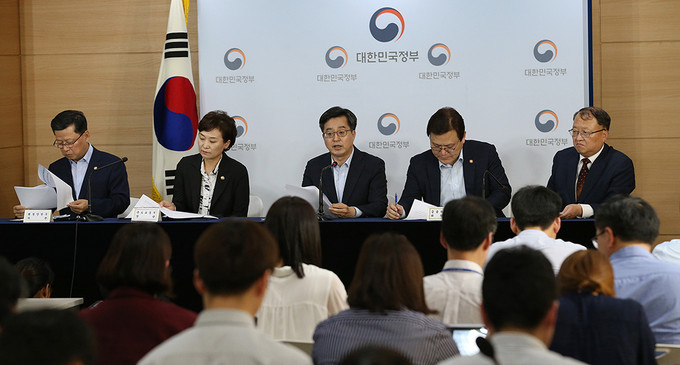 김동연 부총리 겸 기획재정부 장관과 김현미 국토교통부 장관, 최종구 금융위원장이 13일 오후 서울 종로구 정부서울청사에서 주택시장 안정방안 관련 관계부처 합동브리핑을 하고 있다.