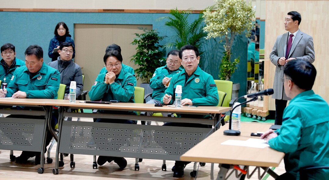 ▲ 최상목 대통령 권한대행 부총리 겸 기획재정부 장관이 29일 오후 전남 무안 망운문화복지센터에서 김영록 전남도지사, 강기정 광주광역시장, 김산 무안군수 등 관계자들이 참석한 가운데 무안공한 항공기 폭발사고와 관련 대책회의를 하고 있다. [전남도 제공]
