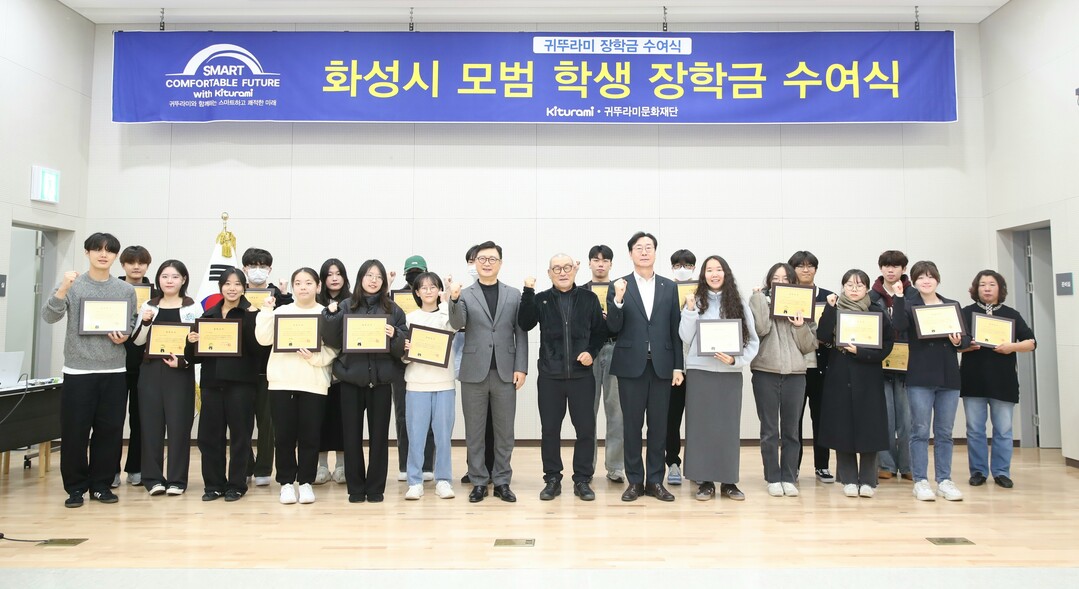 11일 화성시에 따르면 지난 10일 화성시 평생학습관에서 정명근 화성시장과 그룹 창업주 최진민 회장, 임선일 화성시인재육성재단 대표이사 등 100여 명이 참석한 가운데 '귀뚜라미 그룹 장학금 수여식'이 열렸다.