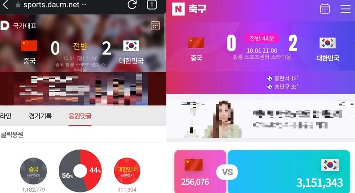 카카오에 따르면, 한중 8강전 당시 다음에서 총 3130만건의 ‘클릭 응원’이 있었다. 이 중 중국 클릭 응원이 93.2%(2919만 건)로 한국 클릭 응원 6.8%(211만 건)를 압도하는 ‘이상 현상’이 나타났다.