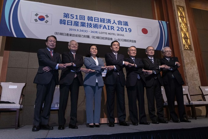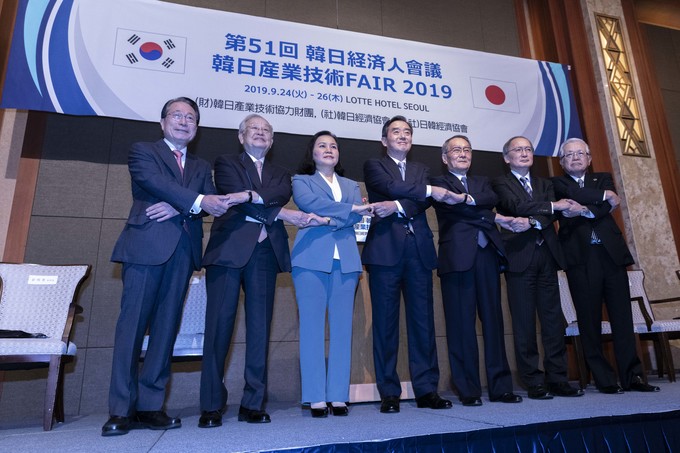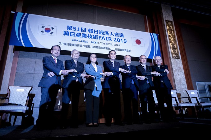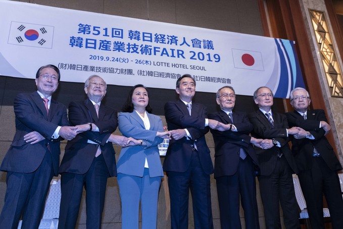 제51회한일경제인회의가 24일 오후 서울 소공동 롯데호텔에서 열린 가운데 참석자들이 기념촬영을 하고 있다. 왼쪽부터 유명환 전 외교통상부 장관, 손경식 한국경영자총협회 회장, 유명희 산업통상자원부 통상교섭본부장, 김윤 한일경제협회 회장, 사사키 미키오 일한경제협회 회장, 나가미네 야스마사 주한일본대사, 고가 노부유키 일한경제협회 부회장.