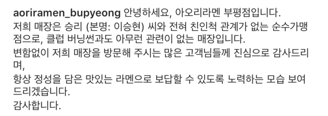아오리라멘 부평점은 지난 24일 인스타그램에 "승리와 전혀 친인척 관계가 없는 순수가맹점으로, 클럽 버닝썬과도 아무런 관련이 없는 매장"이라고 공지를 올렸다.