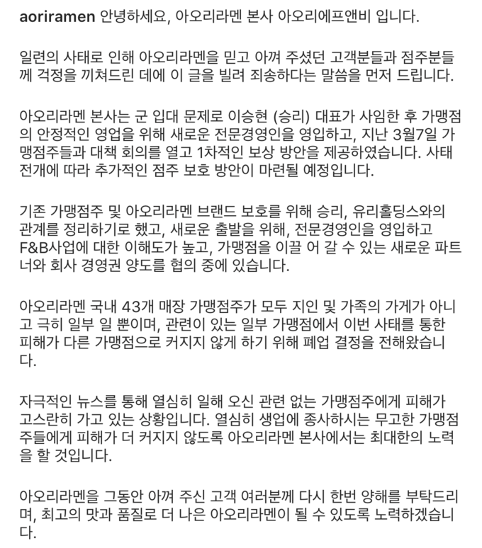 그러면서 "기존 가맹점주 및 아오리라멘 브랜드 보호를 위해 승리, 유리홀딩스와의 관계를 정리하기로 했다"면서 "전문경영인을 영입하고 F&B사업에 대한 이해도가 높고, 가맹점을 이끌어 갈 수 있는 새로운 파트너와 회사 경영권 양도를 협의하고 있다"고 설명했다.