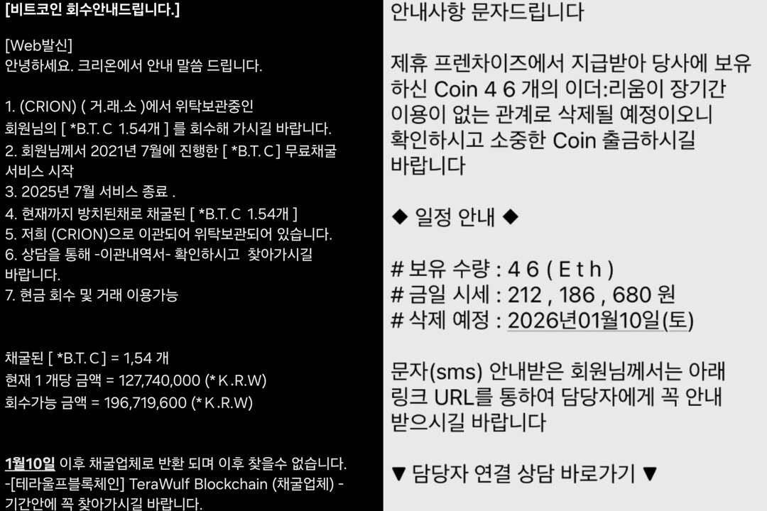 가상자산 투자자 김 모(34세·남) 씨도 며칠 전 비슷한 내용의 문자를 받았다. 비트코인 1.54개를 위탁 보관 중이라며 현재 시가로 그 가치가 1억9671만 원에 달한다고 안내했다.