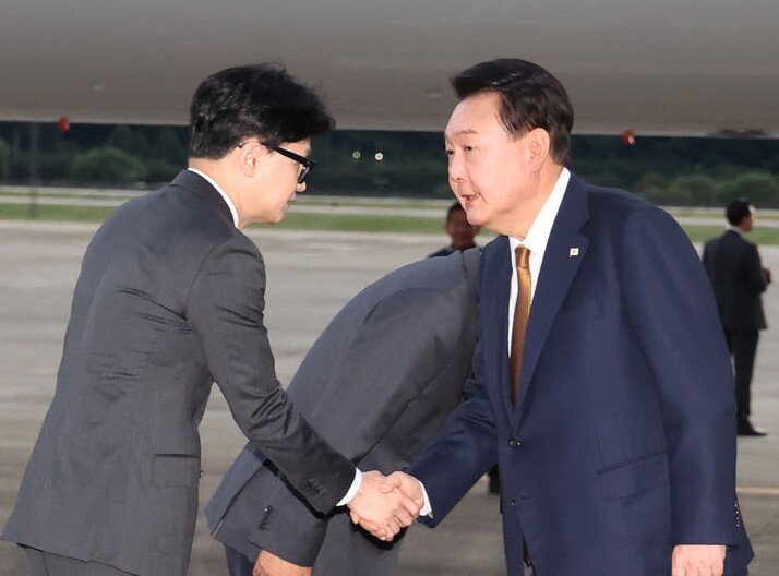 | ▲ 윤석열 대통령이 지난 22일 체코 공식 방문을 마치고 성남 서울공항을 통해 귀국하며 환영 나온 국민의힘 한동훈 대표와 악수하고 있다. [뉴시스] |