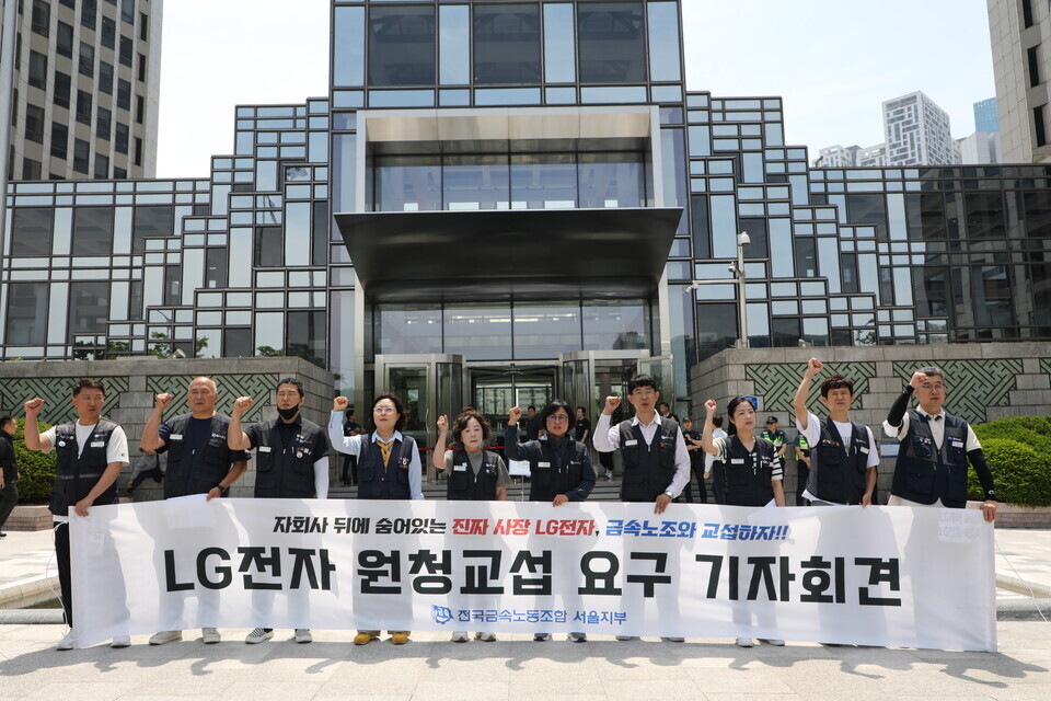 | ▲ 금속노조 서울지부가 지난 5월 26일 서울 여의도 LG트윈타워 앞에서 'LG전자 원청교섭 요구 기자회견'을 열고 있다. [금속노조] |