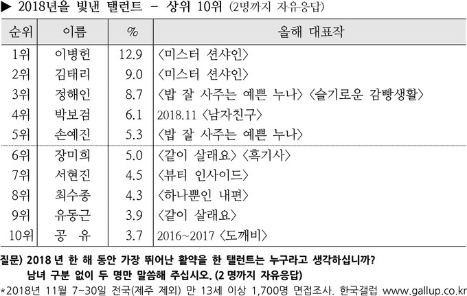 ▲ 2018년을 빛낸 탤런트 상위 10위 [한국갤럽 제공]