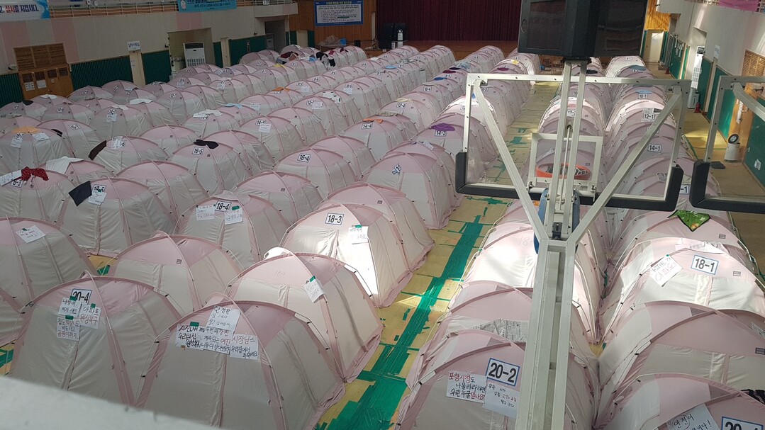 ▲ 2017년 발생한 지진 발생 당시 포항시 북구 흥해실내체육관에 마련된 이재민 임시 대피소. [장영태 기자]