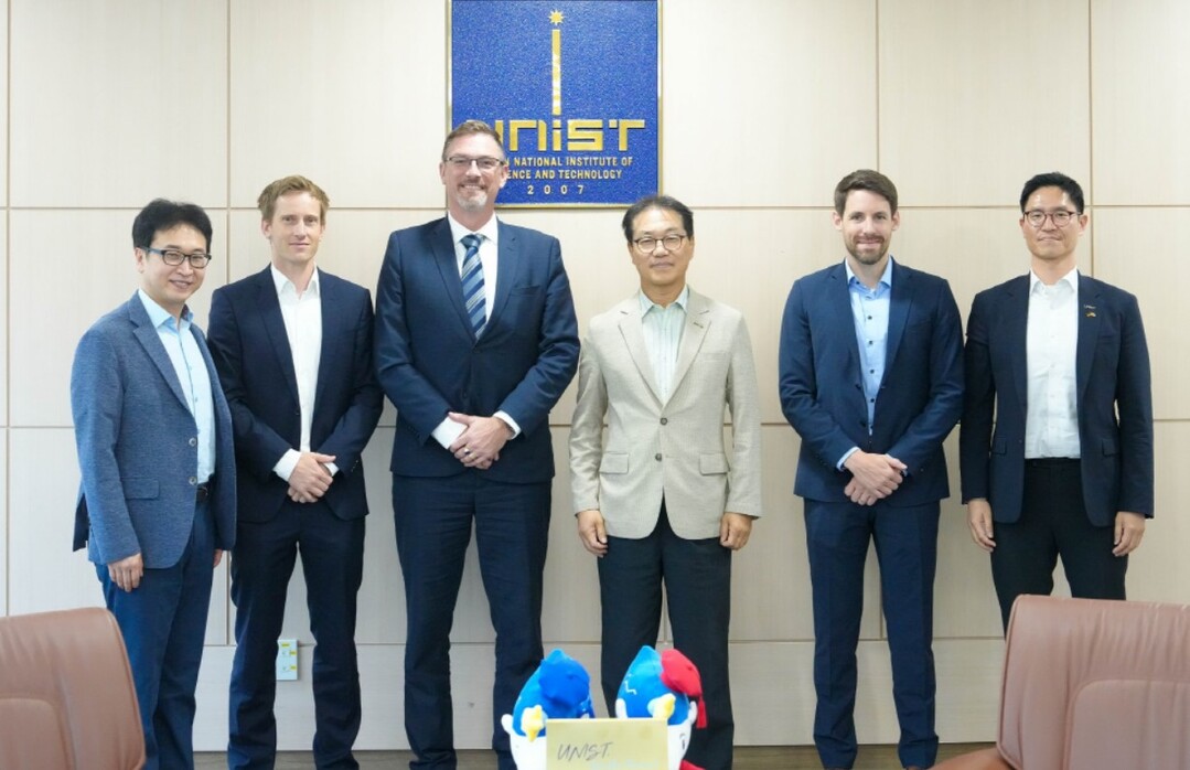 | ▲ 박종래 총장(왼쪽 네 번째)과 프랭크 헤닝 프라운호퍼 ICT 연구소장 등 관계자들이 기념사진을 촬영하고 있다. [울산과학기술원 제공] |