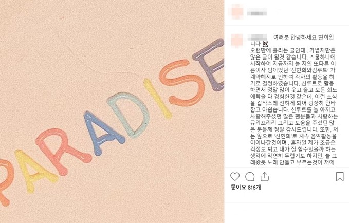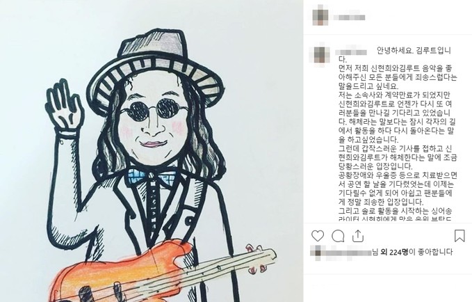신현희의 말대로 아쉽지만 아름다운 이별인 줄 알았던 해체의 실상은 그렇지 않았다. 소속사와 신현희의 입장이 나온 이날 김루트도 자신의 인스타그램을 통해 입장을 말했다.