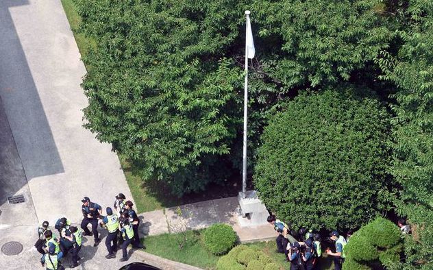 이들은 '주권 침탈 아베 규탄'이라고 적힌 현수막을 페트병에 달아 담장 밖으로 던지기도 했다.