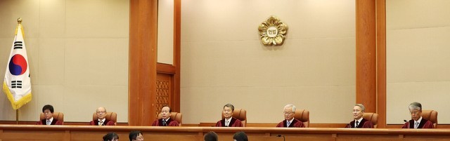 ▲ 이진성 헌법재판소장을 비롯한 헌법재판관들이 30일 오후 서울 종로구 헌법재판소 대심판정에서 헌법소원 심판 선고를 위해 자리하고 있다. [뉴시스]