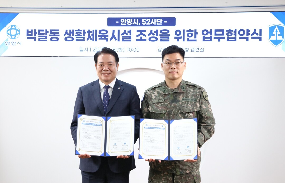 경기 안양시가 주민 생활체육 활성화를 위해 8일 육군 제52사단과 '생활체육시설 조성 및 운영'을 위한 업무협약을 체결했다.