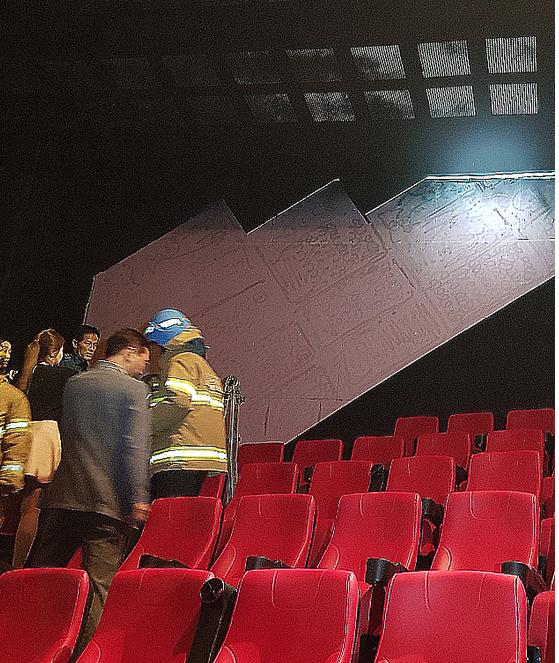 떨어진 흡음재는 상영관 뒤편 벽면 2∼3m 높이에 설치돼 있던 것으로, 폴리보드 재질에 가로·세로 5m·80㎝ 크기이다.