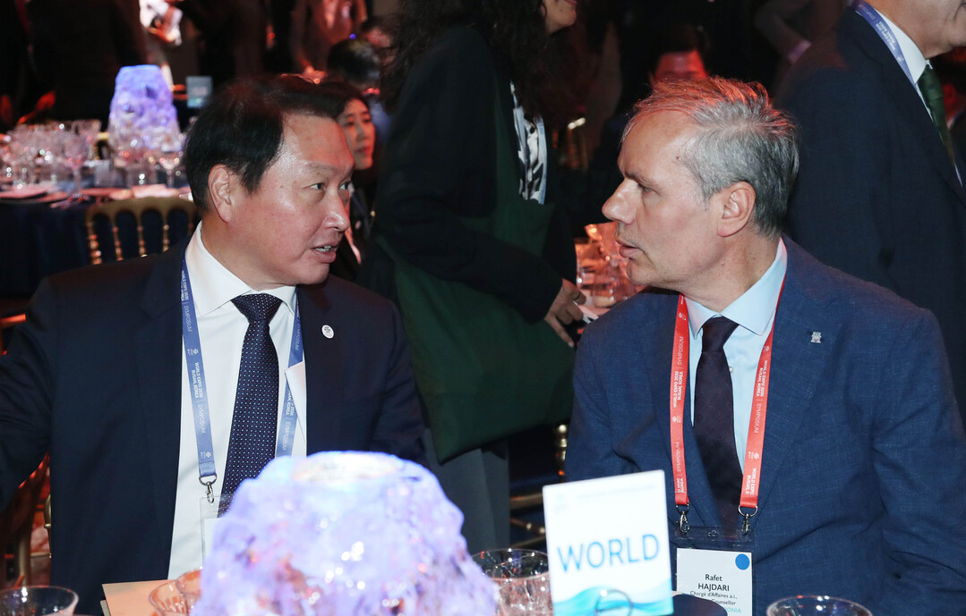 | ▲ 최태원 대한상의 회장(왼쪽)이 '2030부산세계박람회 심포지움 만찬'에서 라펫 하다리(rafet hajdari) 북마케도니아 BIE 대표에게 '2030 부산세계박람회'에 대해서 설명하고 있다. [대한상의 제공] |
