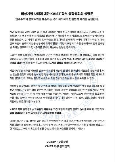 이어 "반헌법적 비상계엄 선포는 총학생회 또한 탄압하는 행동"이라며 "우리는 'KAIST 학생선언' 제 10조에 따라 정당한 권리를 지키기 위해 저항할 권리를 가지며, 이에 반해 시위·집회·언론·출판의 자유를 억압하는 모든 행위를 거부한다"고 강조했다.