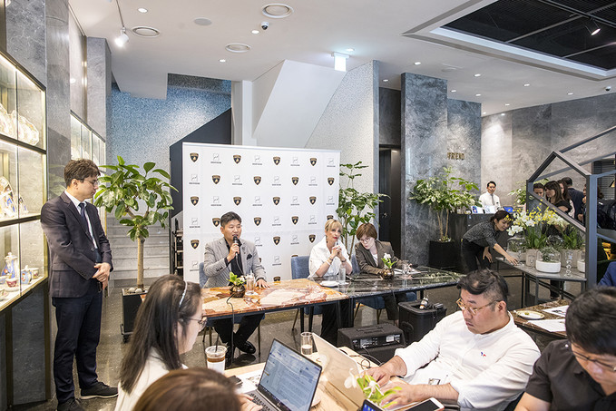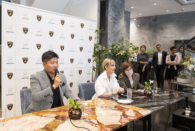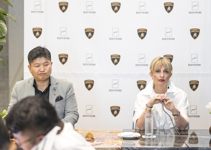 박상현 바디프랜드 대표이사와 카티아 바시 람보르기니 최고마케팅책임자(CMO)가 5일 오전 서울 강남구 카페 드 바디프랜드 청담에서 열린 람보르기니 안마의자 전용관 'Lounge S' 오픈 기자간담회에 참석해 있다.