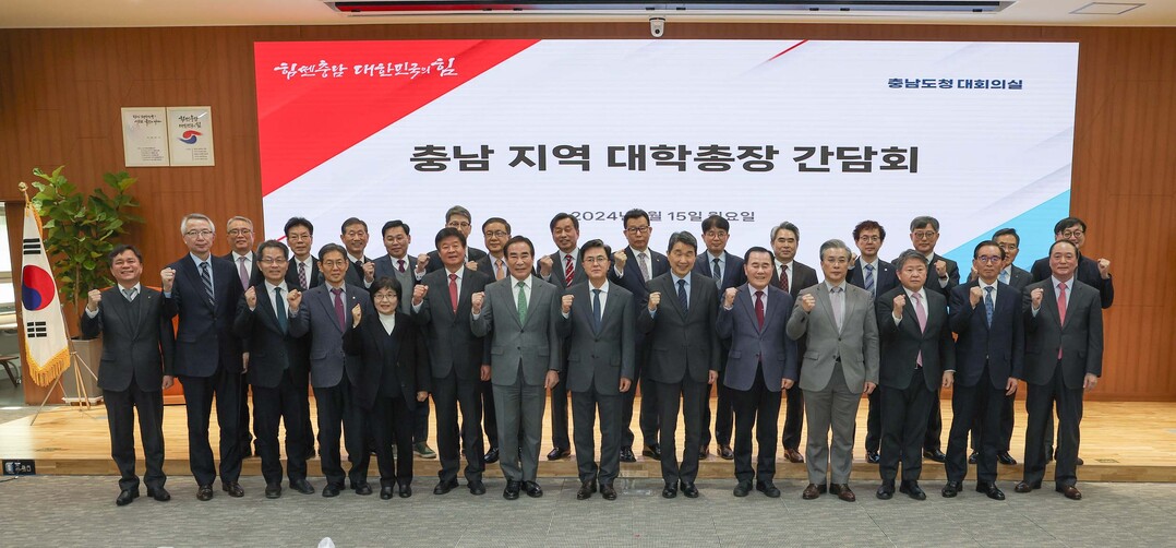 ▲ 이주호 부총리와 김태흠 지사가 충남지역 대학총장 들과 파이팅을 외치고 있다.[충남도 제공]
