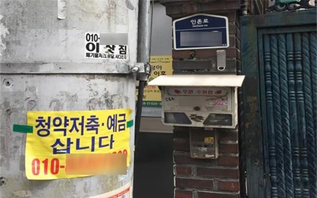 A씨는 서울 주택가 전봇대에서 '청약저축·예금 삽니다'라고 적힌 전단지를 보고 여기에 적힌 연락처로 전화를 했다.