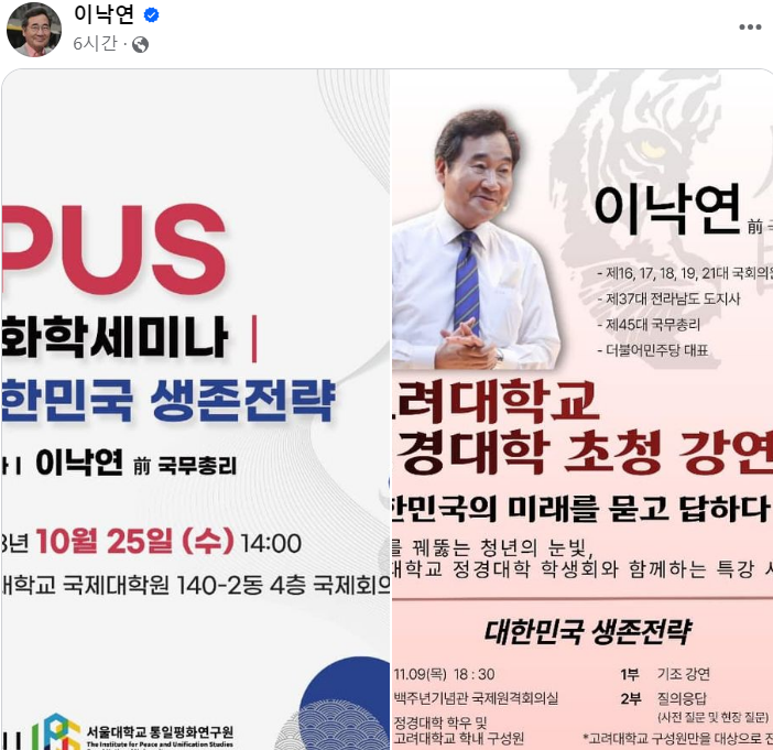 이 전 대표는 25일에는 서울대에서 강연한다. 서울대 통일평화연구원 주최로 오후 2시부터 국제대학원 국제회의실에서 학생들을 만난다.