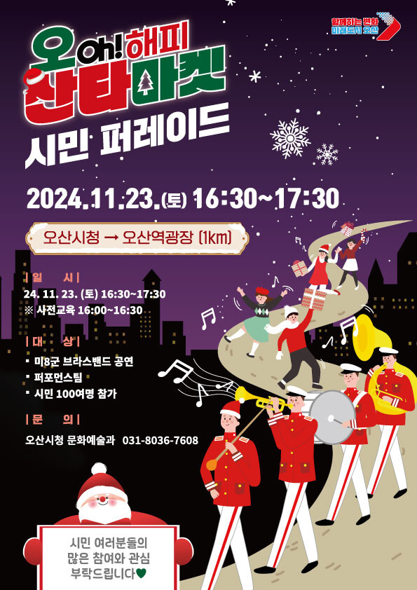 경기 오산시는 오는 23일부터 다음달 29일까지 진행되는 지역 대표 겨울 축제인 '오(Oh)! 해피 산타마켓' 개최에 앞서 개막식 날인 23일 화려한 거리 퍼레이드를 펼친다고 21일 밝혔다.