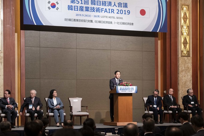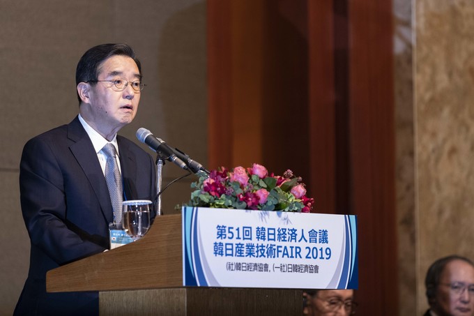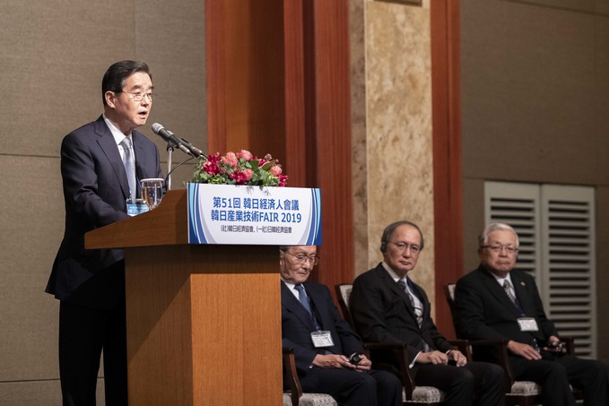 김윤 한일경제협회 회장이 24일 오후 서울 소공동 롯데호텔에서 열린 제51회 한일경제인회의에 참석, 개회사를 하고 있다.