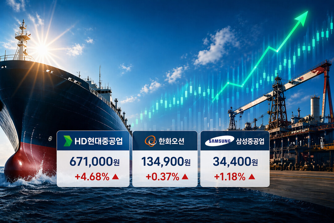 | ▲ 조선 빅3(HD현대중공업·한화오션·삼성중공업) 주가가 24일 동반 상승 마감하며 수주 확대 기대를 반영한 강세 흐름을 보이고 있다. [챗GPT 생성] |