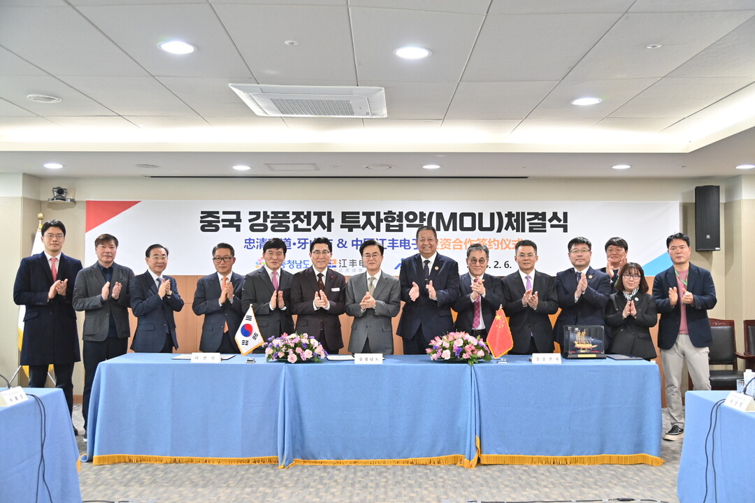 왕쉐쩌 중국 강풍전자 총경리는 6일 충남도청에서 김태흠 지사, 박경귀 아산시장과 투자협약(MOU)을 체결했다.