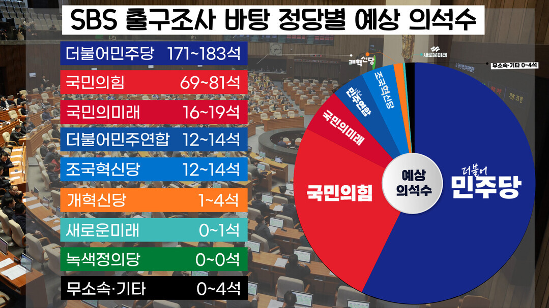 KBS 보도에선 민주당 178~196석, 국민의힘 87~105석이었다. 새로운미래는 0~2석, 개혁신당은 1~4석, 조국혁신당 12~14석이었다.