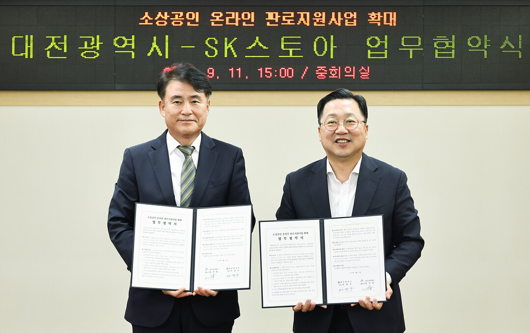 대전시가 지역 소상공인의 온라인 시장 진출 지원을 위해 SK스토아와 11일 업무협약을 체결했다.