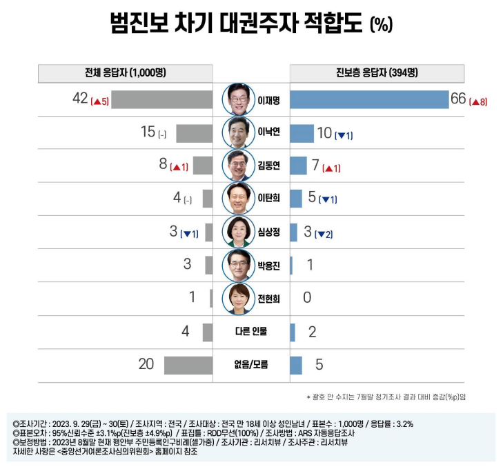이재명 대표는 범진보 차기 대권주자 적합도에서 42%를 얻었다. 전달 대비 무려 5%p 뛰었다. 2위는 이낙연 전 대표로 15%였다. 지지율 변화가 없었다.