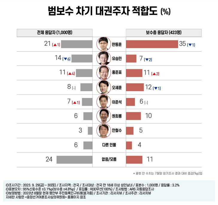 보수층 응답자에선 한 장관이 35%의 적합도를 얻어 경쟁자를 오차범위 밖으로 크게 따돌렸다. 한 장관은 전달 대비 1%p 하락했으나 2위와의 격차가 23%p에 달할 만큼 앞서 나갔다. 오 시장(12%)과 홍 시장(11%), 원 장관(10%)은 힘겹게 두 자릿수를 유지했다.