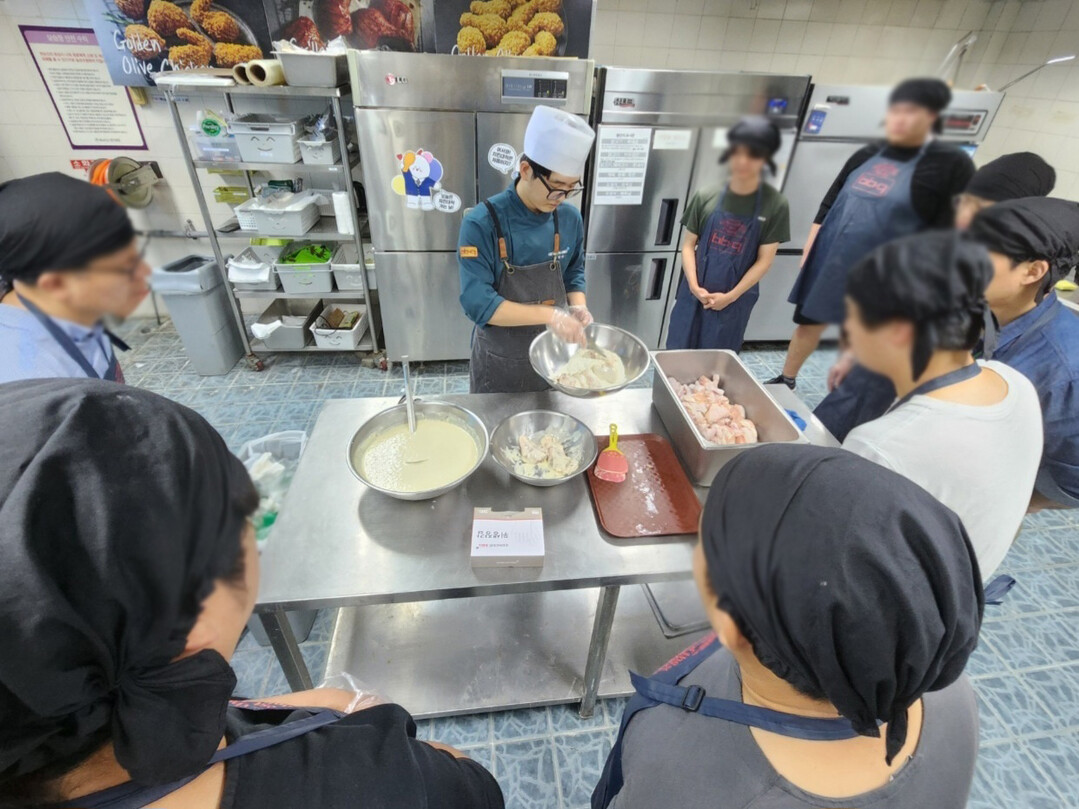 | ▲BBQ 치킨대학에서 진행한 정직원 채용연계형 진로캠프에 참석한 자립준비청년들이 BBQ 황금올리브 치킨 조리 체험을 위해 만드는 과정을 배우고 있다.[제너시스BBQ 제공] |