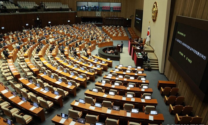 | ▲ 9일 국회 본회의에서 더불어민주당 주도로 속칭 '노란봉투법' 표결 처리를 위한 절차가 진행되고 있다. 국민의힘 의원들은 야당의 단독 처리 강행에 항의하며 집단 퇴장해 자리가 비어 있다. [뉴시스] |