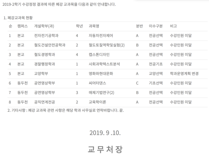 ▲ 동양대 홈페이지에 올라온 폐강 과목 현황에 정경심 교수가 맡은 '영화와 현대문화' 과목이 포함됐다. [동양대 홈페이지 캡처]