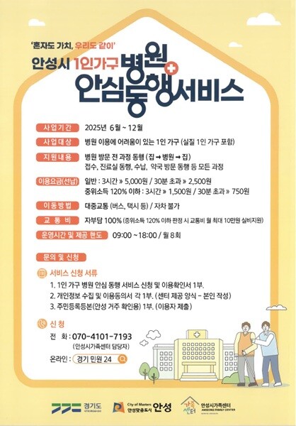 경기 안성시는 지난 18일부터 혼자 병원 진료와 검사, 치료 등을 받기 어려운 1인 가구를 대상으로 '병원 안심 동행 서비스'를 시행 중이다.