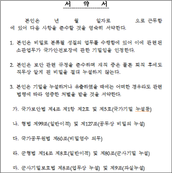 '이유 여하를 막론하고 처벌 받는다'고 명시돼 마치 공익신고를 해도 처벌받는 것처럼 착각을 유발한다는 것이다. 채 의원이 공개한 보안서약서에는 이와 함께 일반이적죄, 국가기밀 누설죄, 공무상 비밀누설죄 등의 처벌 근거가 열거돼 있다.