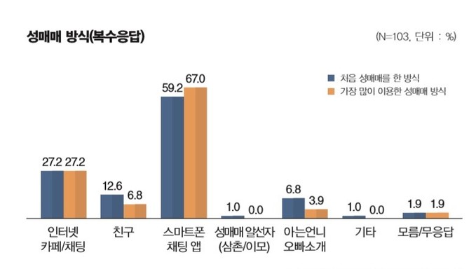2016년 국가인권위원회 '아동·청소년 성매매 환경 및 인권 실태조사 보고서'에 따르면 성매매에 가장 많이 이용된 경로는 채팅앱이 1위(67.0%), 인터넷카페·채팅이 2위(27.2%) 순이었다. 같은해 여성가족부가 발표한 '2016 성매매 실태조사'에서도 조건만남 경로 중 1순위는 채팅앱(37.4%)이었다. 2순위는 랜덤채팅앱(23.4%), 3순위는 채팅사이트(14.0%)로 모두 합해 온라인채팅을 통한 성매매가 전체의 75%에 달했다.