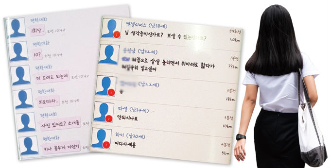 채팅 애플리케이션(앱)에 20세 여성으로 가입해 접속하자 쪽지가 쏟아졌다. '많이드림'이라는 닉네임을 쓰는 한 남성은 처음부터 "프로필과 사이즈를 말해 달라"고 했다. '간단'은 삽입하지 않고 남성이 사정하는 방식을, '조건'은 완전한 성관계를 의미한다. 횟수에 따라 한 번에 20만원, 두 번에 35만원.