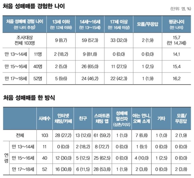 경찰청 자료를 보더라도 성매매 피해 청소년의 평균 연령은 약 15세로 전체 피해자 중 58.2%가 13~15세의 여학생들이었다. 성매매 강요범과 알선범 중 절반 이상(56.6%) 역시 10대였다. 앱으로 미성년자를 유인한 뒤 성매매를 알선하는 조직체계가 갖춰져 있고, 이를 악용하는 사람들의 나이도 점점 더 어려진다는 의미다.